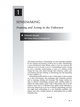 Sensemaking, a term introduced by Karl Weick, refers to how we structure the unknown so as to be able to act in it. Sensemaking involves coming up with a plausible understanding—a map—of a shifting world; testing this map with others through data collection, action, and conversation; and then refining, or abandoning, the map depending on how credible it is. Sensemaking enables leaders to have a better grasp of what is going on in their environments, thus facilitating other leadership activities such as visioning, relating, and inventing. This chapter outlines ten steps to effective sensemaking, grouped under enabling leaders to explore the wider system, create a map of that system, and act in the system to learn from it. It illustrates how rigidity, leader dependence, and erratic behavior get in the way of effective sensemaking, and how one might teach sensemaking as a core leadership capability. The chapter ends with a student manual on sensemaking from an MBA leadership class.